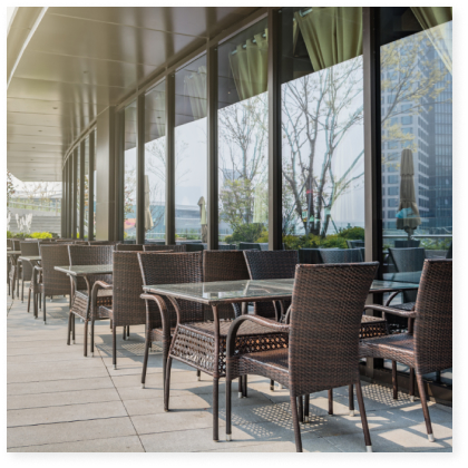 • комплекты для открытых террас и уличных площадок кафе и ресторанов — эстетичны, сохраняют внешний вид даже при воздействии прямых солнечных лучей, пыли и перепадов температур.