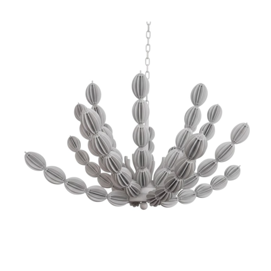Люстра INDY by Romatti — это уникальное сочетание органичного дизайна и изысканности. Её конструкция напоминает ветвистое растение или кактус: множество «стеблей» расходятся от центральной основы, каждый из которых украшен матовыми элементами в форме овалов. Белый цвет придаёт изделию лёгкость и воздушность, а рельефная текстура плафонов создаёт интересную игру света и тени.