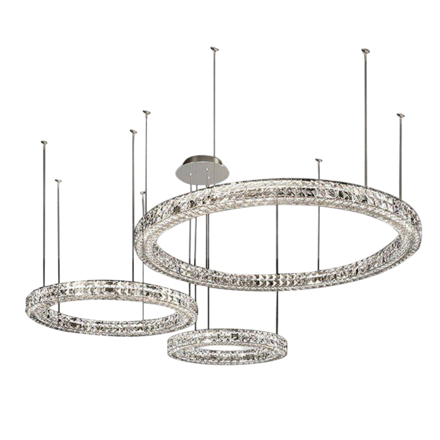 Модель представлена в различных размерах и конфигурациях (одно кольцо или композиция из нескольких), позволяя подобрать идеальное решение для любого объема помещения и создать уникальную световую инсталляцию.