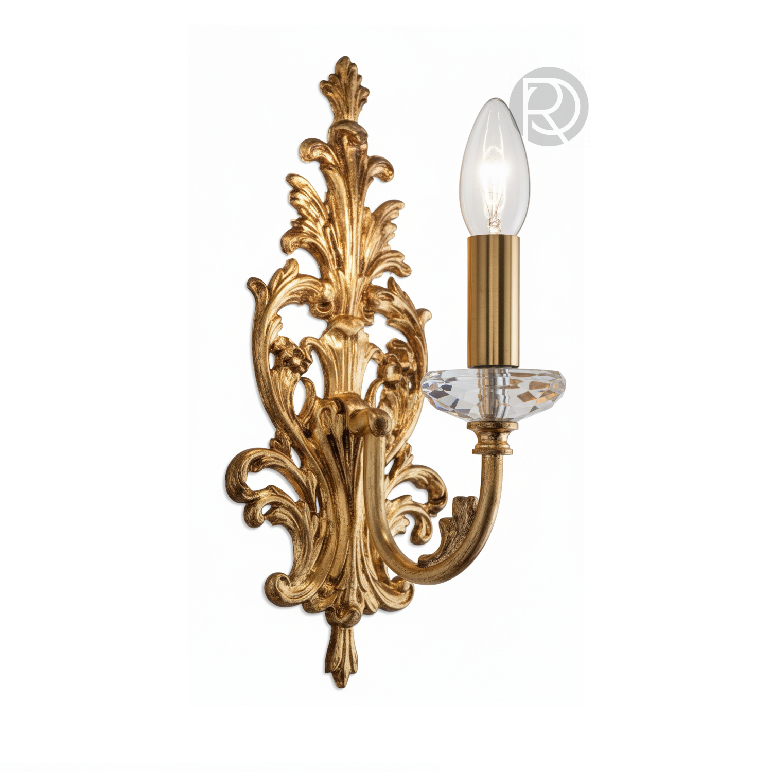 Основание бра выполнено с богатым орнаментом в стиле барокко или классицизма. Роскошный золотистый цвет и искусная детализация придают ему вид настоящего антикварного шедевра. Кристаллическая чаша под патроном лампы ловит и мягко рассеивает свет, добавляя элегантный блеск и визуальную легкость.