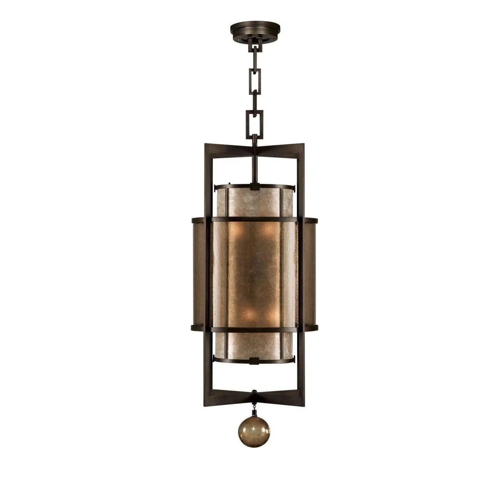 Особенность модели — изящная цепочка крепления, дополняющая общий дизайн и подчёркивающая его утончённость. В нижней части светильника расположен декоративный элемент в виде шара, который добавляет композиции завершённости и лёгкой игривости. Сочетание прямых линий рамы и округлого акцента создаёт гармоничный баланс между строгостью и изяществом.