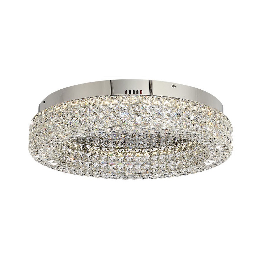 Светильник состоит из сотен тщательно отобранных элементов, формирующих плотное полотно из чистого хрусталя. Сочетание крупных граненых кристаллов по периметру и мелкой россыпи в центральной части создает эффект глубокого, объемного свечения..